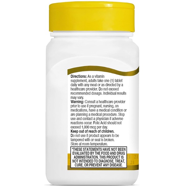 هر قرص از فولیک اسید سنتری 21st Century حاوی 400 میکروگرم فولیک اسید است. این میزان برای تأمین نیاز روزانه بدن به فولیک اسید مناسب است. این مکمل علاوه بر فولیک اسید، شامل ترکیبات دیگری نظیر کلسیم، سلولز، سیلیکون دیاکسید و استئاریک اسید میباشد که برای فرموله شدن این محصول و تسهیل در مصرف آن مورد استفاده قرار گرفتهاند.