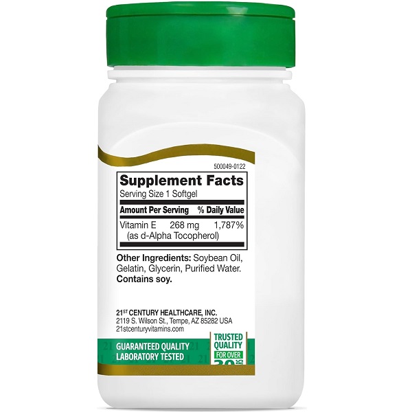 هر کپسول از ویتامین E سنتری 21st Century حاوی 180 میلیگرم ویتامین E است که معادل 1200% از میزان توصیهشده روزانه (DV) میباشد. ویتامین E در این مکمل به صورت dl-Alpha Tocopheryl Acetate موجود است که یکی از اشکال فعال ویتامین E است و بهطور مؤثر به بدن جذب میشود.