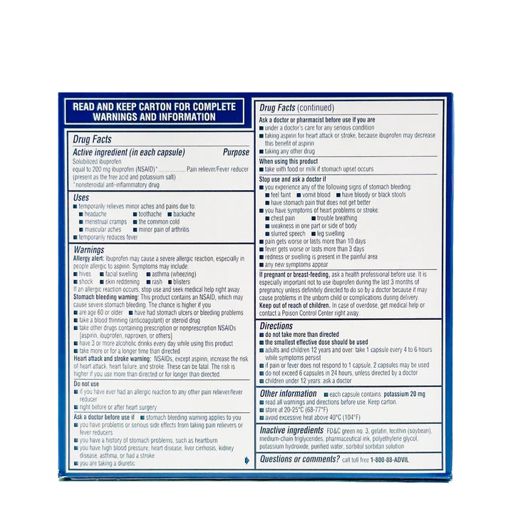کپسول ژلاتینی ایبوپروفن 200 میلی گرم ادویل بسته 2 عددی Advil Liqui-Gels تسکین سریع دردهایی مانند سردرد، کمردرد و درد عضلانی را ارائه می دهد. برای بیش از 30 سال است که ادویل یک مسکن بی خطر و موثر و کاهش دهنده تب است. این مسکن به خوبی می تواند دردهای جزئی ناشی از سردرد، سرماخوردگی، دندان درد، دردهای عضلانی، کمردرد، دردهای جزئی آرتریت و دردهای قاعدگی را به طور موقت تسکین دهد و تب را به طور موقت کاهش دهد.