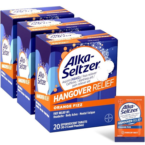 تسکین سریع الاثر در حدود 15 دقیقه: قرص جوشان آلکاسلتزر Alka-Seltzer Hangover Relief یک نوشیدنی گازدار و با طعم پرتقال است که می تواند در عرض 15 دقیقه خیلی سریع عمل کند.