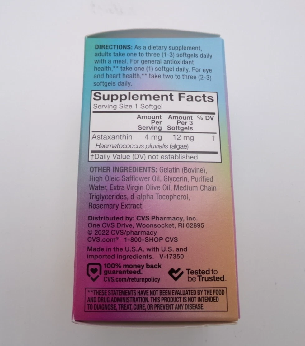 بدون عوارض جانبی: CVS Health Astaxanthin محصولی طبیعی است که در صورت مصرف طبق دوز پیشنهادی، هیچ عوارض جانبی جدی ندارد و برای استفاده روزانه مناسب است.