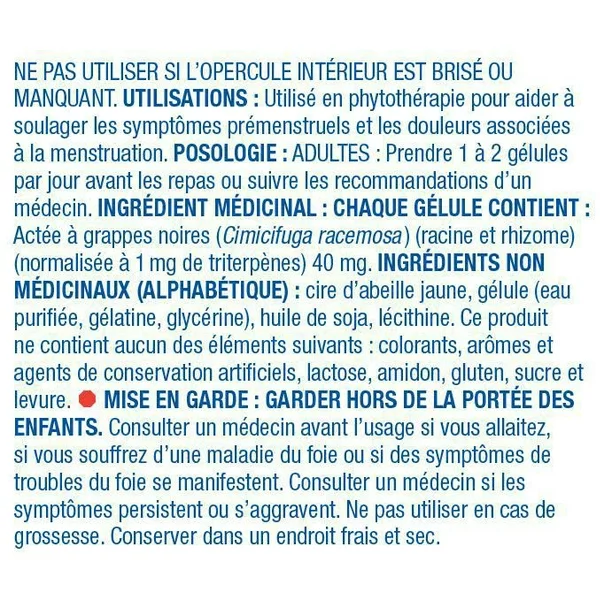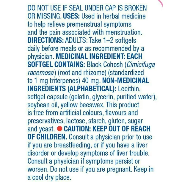 در هر سافت ژل 400 میلی گرم کوهوش سیاه (Cimicifuga racemosa) (ریشه و ریزوم) (استاندارد شده تا 1 میلیگرم تری ترپن)، لسیتین، کپسول سافت ژل (ژلاتین، گلیسیرین، آب تصفیه شده)، روغن سویا، موم زنبور عسل زرد را ارائه می دهد.
