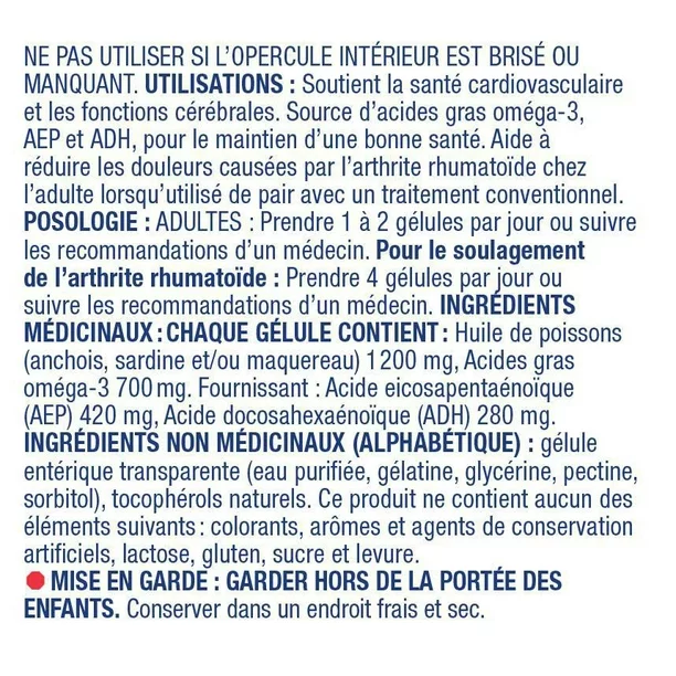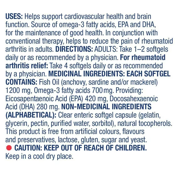 امگا 3 اکویت 1200 میلی گرم 100 عدد Equate Extra Strength Omega-3 به حمایت از سلامت قلب و عروق و عملکرد مغز کمک می کند. این محصول منبع اسیدهای چرب امگا 3، EPA و DHA است که به حفظ سلامتی شما کمک می کند. حتی این محصول می تواند به کاهش درد آرتریت روماتوئید در بزرگسالان کمک می کند.