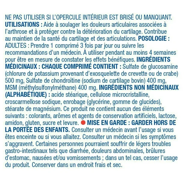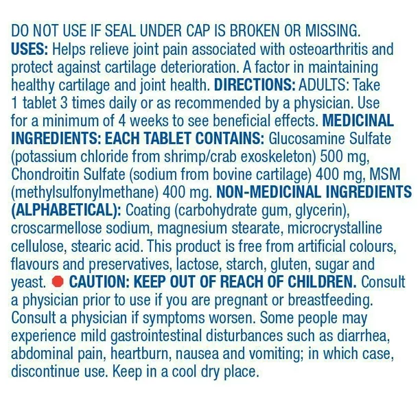 ترکیبات دارویی: هر قرص حاوی: گلوکزامین سولفات (کلرید پتاسیم از اسکلت بیرونی میگو/خرچنگ) 500 میلی گرم، کندرویتین سولفات (سدیم از غضروف گاو) 400 میلی گرم، MSM (متیل سولفونیل متان) 40 میلی گرم. پوشش (صمغ کربوهیدرات، گلیسیرین)، سدیم کراس کارملوز، استئارات منیزیم، سلولز میکروکریستالی، اسید استئاریک.