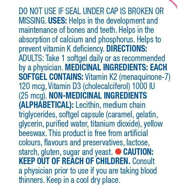 ترکیبات دارویی: هر سافت ژل حاوی: ویتامین K2 (مناکینون-7) 120 میکروگرم، ویتامین D3 (کوله کلسیفرول) 1000 واحد بین المللی (25 میکروگرم) است. ترکیبات غیر دارویی: لسیتین، تری گلیسریدهای زنجیره متوسط، کپسول سافت ژل (کارامل، ژلاتین، گلیسیرین، آب تصفیه شده، دی اکسید تیتانیوم)، موم زنبور عسل زرد