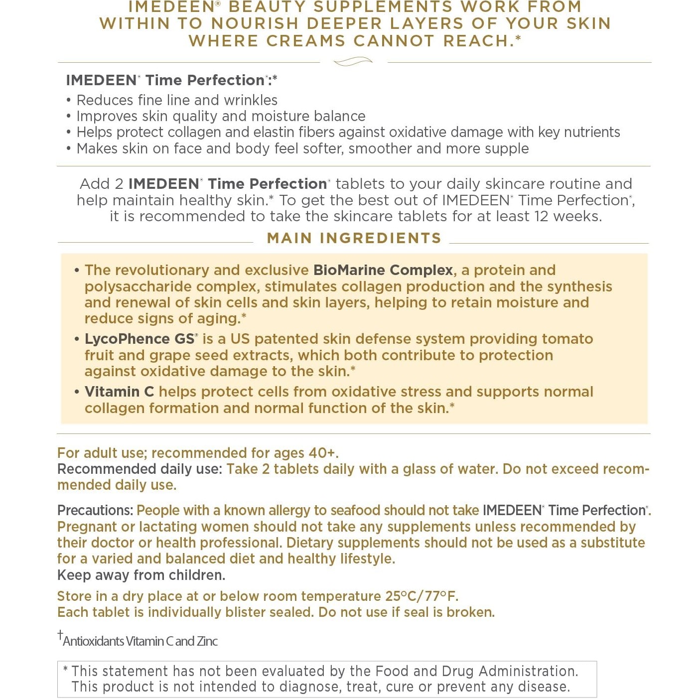 Imedeen Time Perfection ترکیب منحصر بهفردی از مواد فعال دارد که از درون پوست را تغذیه میکنند و از علائم پیری جلوگیری میکنند. مهمترین ترکیبات آن عبارتند از: