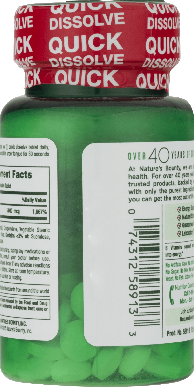 بیوتین نیچرز بونتی در قالب قرص‌های سریع‌الذوب طراحی شده است که مصرف آن بسیار ساده است. برای استفاده از این محصول، کافی است یک قرص را زیر زبان خود قرار دهید و 30 ثانیه صبر کنید تا قرص حل شود، سپس آن را ببلعید. این قرص‌ها علاوه بر بیوتین، دارای طعم طبیعی توت‌فرنگی نیز هستند که تجربه‌ای خوشمزه و لذت‌بخش را در هنگام مصرف برای شما به ارمغان می‌آورد.