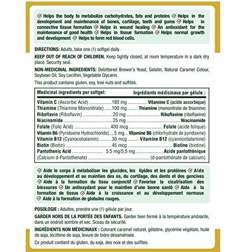 همانطور که از نام محصول پیداست مکمل B کمپلکس نیچرز بونتی 100 عدد همراه با فولیک اسید و ویتامین C از ویتامین های B زیر تشکیل شده است: