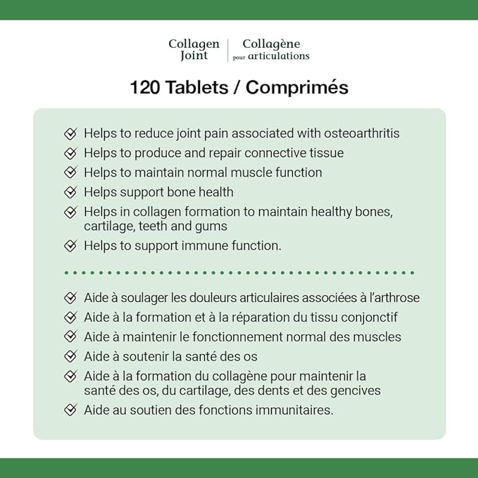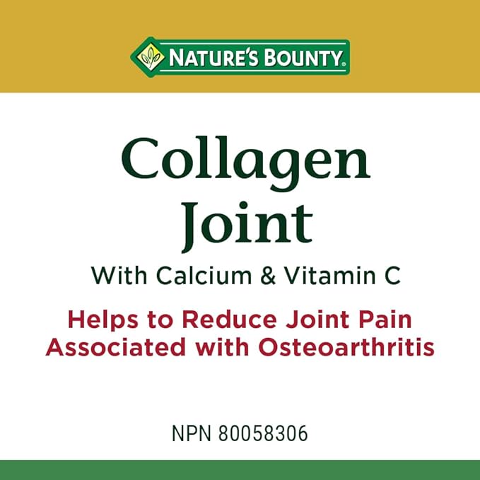 کلاژن جوینت نیچرز بونتی 120 عدد همراه با کلسیم و ویتامین ث Nature’s Bounty Collagen Joint یک راه موثر برای کمک به کاهش درد مفاصل مرتبط با آرتروز است. علاوه بر این، به حمایت از عملکرد سیستم ایمنی و عملکرد طبیعی عضلات کمک می کند. این قرص ها حاوی کلاژن، ویتامین C، بیوتن، مس و کلسیم می باشد.