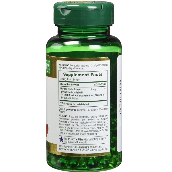 Nature’s Bounty یکی از معتبرترین برندهای مکمل‌های غذایی در جهان است که محصولات خود را با استفاده از مواد اولیه باکیفیت و تحت استانداردهای سختگیرانه تولید می‌کند. عصاره سیر نیچرز بونتی یک گزینه عالی برای افرادی است که می‌خواهند از خواص بی‌نظیر سیر بهره ببرند، بدون اینکه دچار مشکلاتی مانند بوی ناخوشایند سیر شوند. این محصول:
