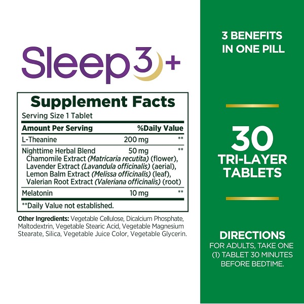 ملاتونین نیچرز بونتی اسلیپ تری 30 عدد Nature’s Bounty Sleep3 دارای ترکیبات زیر است: