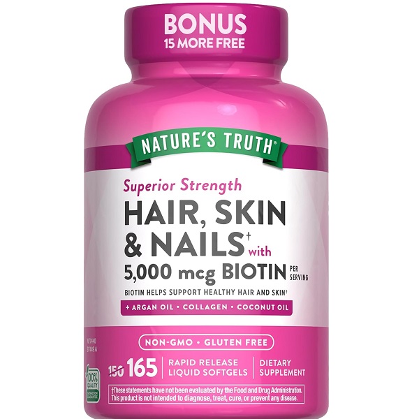 بیوتین یا ویتامین B7 یکی از مهمترین ترکیبات موجود در مکمل Nature’s Truth Hair, Skin & Nails است که هر سروینگ آن حاوی ۵۰۰۰ میکروگرم بیوتین میباشد. بیوتین برای رشد مو و ناخن و همچنین سلامت پوست ضروری است. کمبود این ویتامین باعث شکنندگی ناخنها، ریزش مو و مشکلات پوستی مانند خشکی و التهاب میشود.