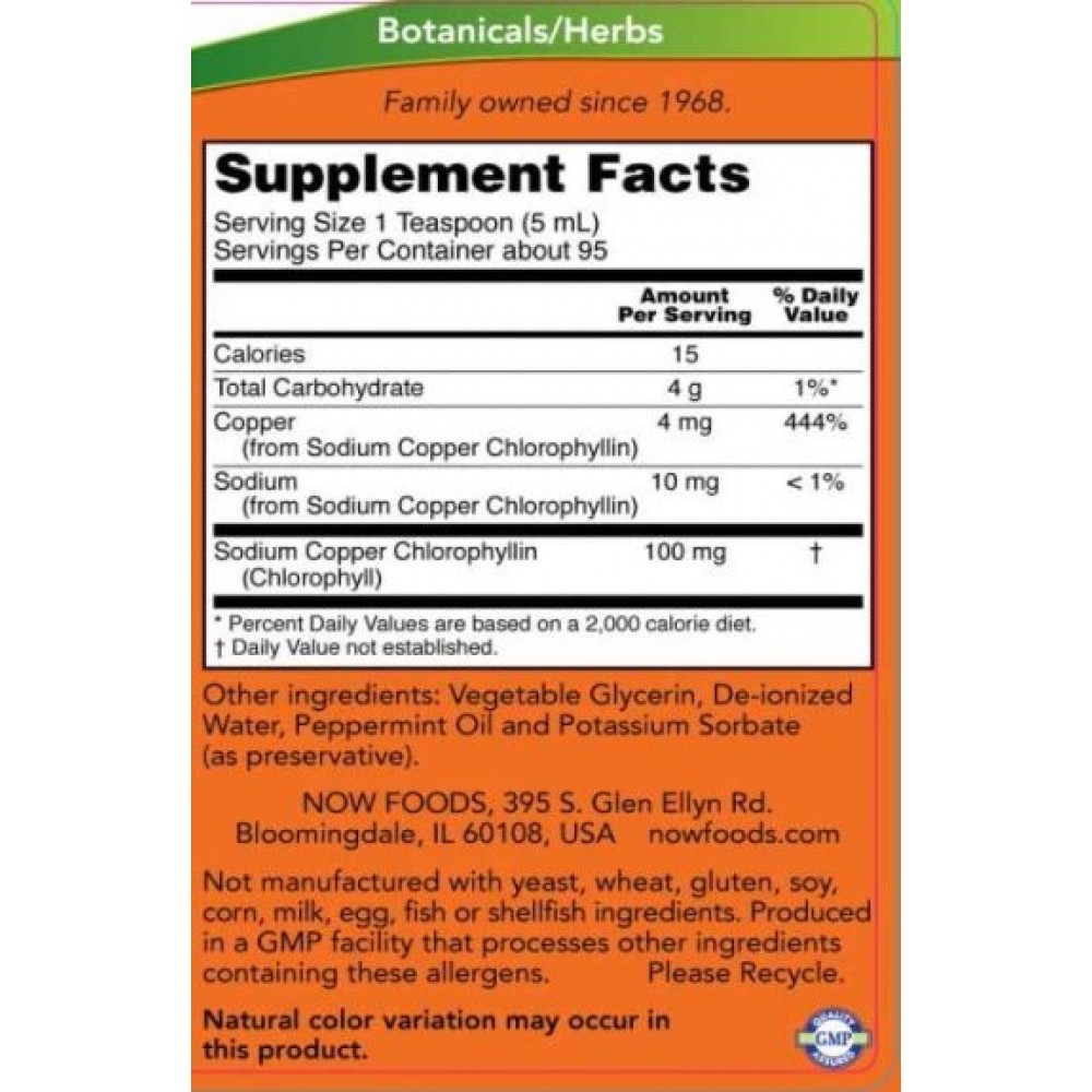 کلروفیل مایع ناو Now Foods Liquid Chlorophyll به سم زدایی بدن کمک می کند. کلروفیل یک رنگدانه سبز است که به طور طبیعی توسط گیاهان و جلبک ها تولید می شود و به آنها رنگ سبز می دهد. کلروفیل برای فتوسنتز، فرآیندی که در آن نور خورشید به انرژی شیمیایی تبدیل میشود، حیاتی است. کلروفیل می تواند به عنوان یک خنثی کننده رادیکال های آزاد عمل کند، ممکن است به حمایت از فرآیندهای سم زدایی بدن کمک کند و به طور سنتی به عنوان یک خوشبو کننده داخلی استفاده می شود. این عصاره محلول در آب به شکل کلروفیلین مس سدیم است.