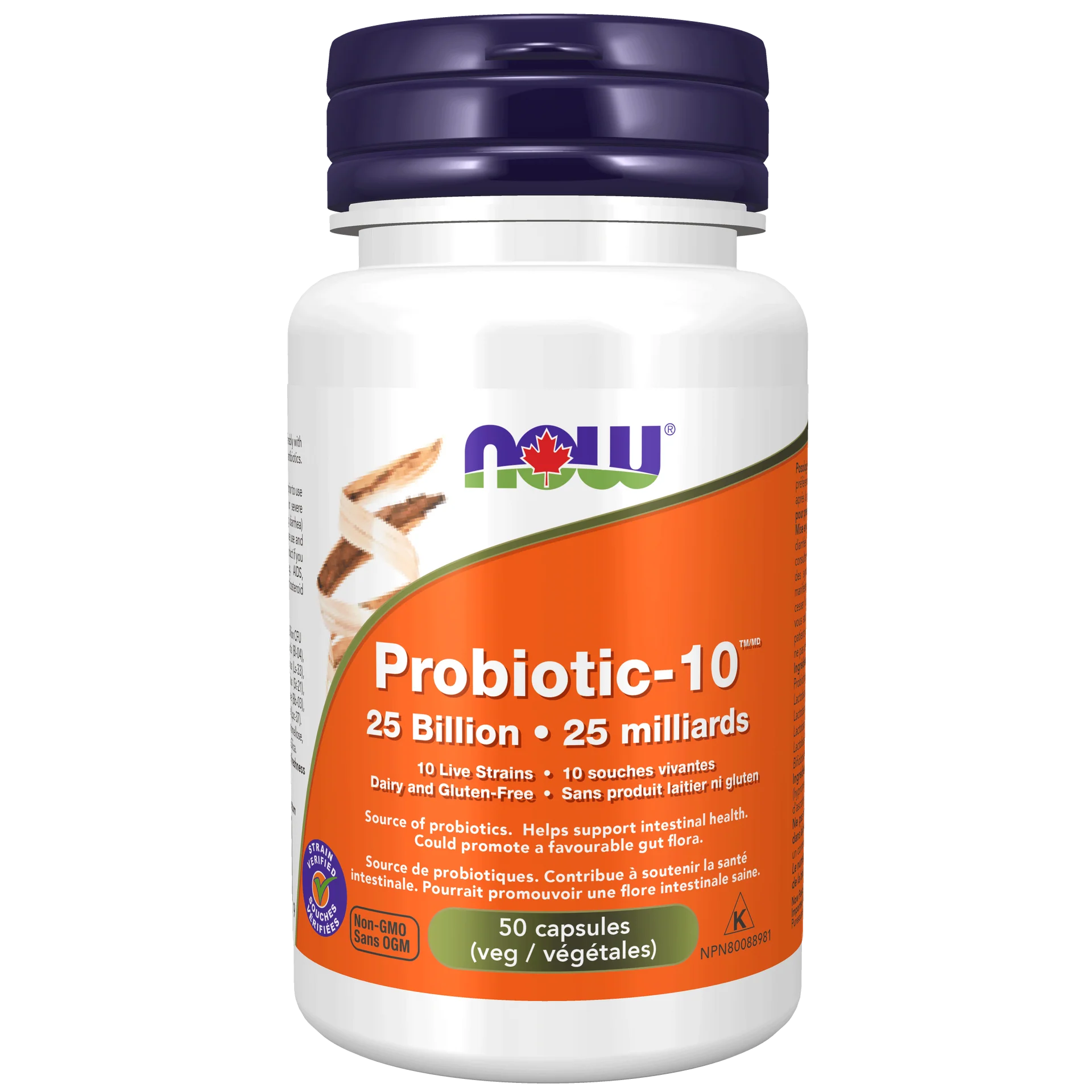 پروبیوتیک ناو 50 عدد NOW Probiotic-10™ 25 Billion به سلامت دستگاه گوارش شما کمک می کند. پروبیوتیک ها میکروارگانیسم های زنده ای مانند باکتری ها و مخمرها هستند که مفید هستند و ممکن است از سیستم گوارشی و ایمنی سالم حمایت کنند. پروبیوتیک-10 طیف متعادلی از ارگانیسمهای زنده متشکل از سویههای باکتریایی پروبیوتیک مقاوم به اسید را ارائه میکند که به طور طبیعی مجرای گوارشی انسان را در بر می گیرد.