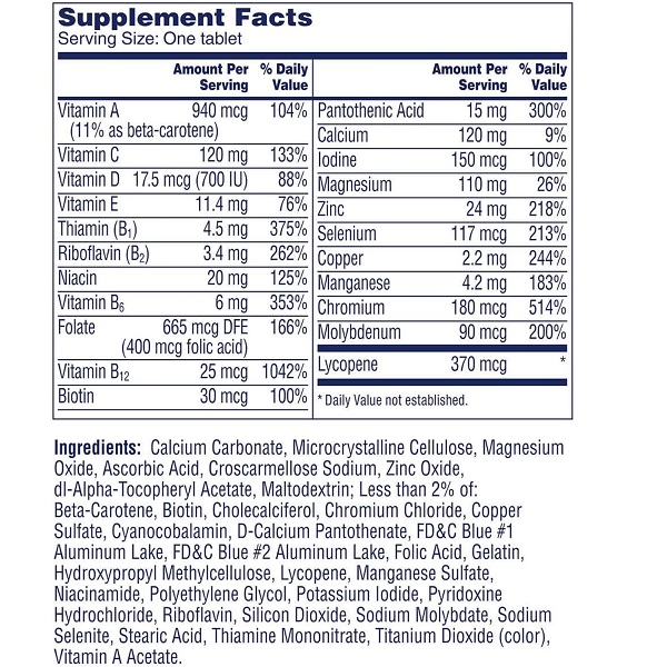 این مکمل شامل انواع ویتامین‌ها و مواد معدنی مورد نیاز برای سلامت کلی بدن است. برخی از مهم‌ترین ترکیبات آن عبارتند از:
