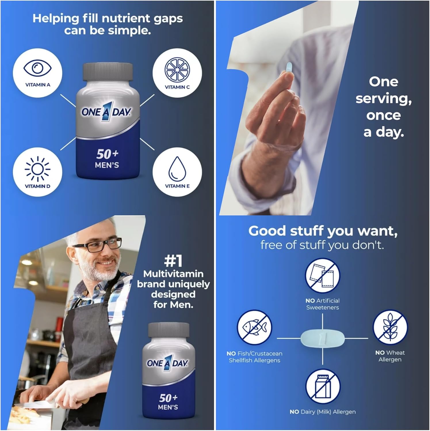 این مکمل با ترکیبی کامل از ویتامین‌ها و مواد معدنی ضروری، کمک می‌کند تا بدن مردان در سنین بالاتر عملکرد بهتری داشته باشد. مولتی ویتامین One A Day Men’s 50 Plus با فراهم کردن بیش از ۱۰۰٪ از مقدار مورد نیاز روزانه حداقل ۱۵ ریزمغذی کلیدی، گزینه‌ای ایده‌آل برای پشتیبانی از سلامت در سنین میانسالی و سالمندی محسوب می‌شود.