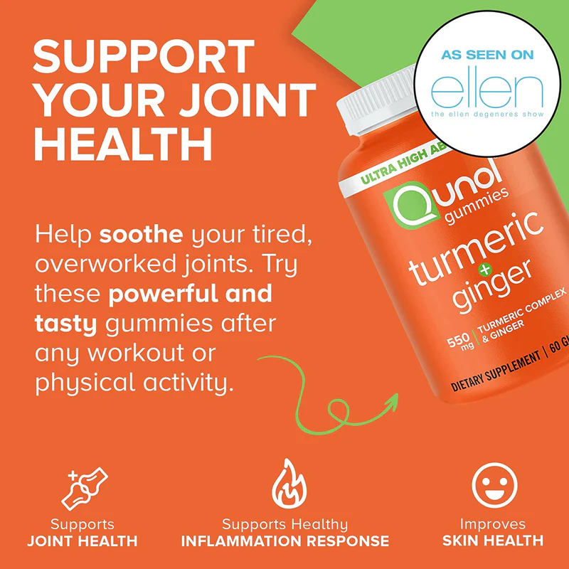 پاستیل زردچوبه زنجبیل کیونول Qunol Turmeric + Ginger به مفاصل شما کمک می کند. زردچوبه و زنجبیل برای تسکین خستگی مفاصلی که تحت فشار بوده اند مناسب است. این پاستیل ها از پاسخ التهابی سالم مرتبط با فعالیت بیش از حد فیزیکی پشتیبانی می کند و همچنین می تواند به راحتی مفاصل کمک کند. می توانید پاستیل ها را بعد از تمرین امتحان کنید.