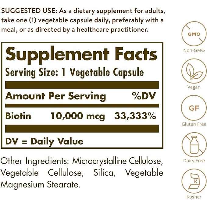 بیوتین سولگار Solgar Biotin 10000 Mcg یکی از مکمل های ویتامین B است که به سلامت پوست، مو و ناخن کمک می کند و برای عملکرد صحیح آنزیم های خاصی ضروری است. بیوتین همچنین از تولید انرژی در بدن پشتیبانی می کند و برای متابولیسم پروتئین، کربوهیدرات و چربی مورد نیاز است.