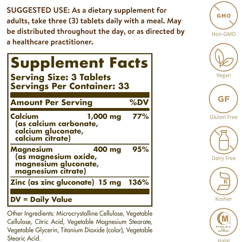 کلسیم منیزیم زینک سولگار Solgar Calcium Magnesium Plus Zinc به بهبود سلامت دندان ها و استخوان های سالم کمک می کند. یک رژیم غذایی سالم (با کلسیم کافی) و ورزش منظم باعث ایجاد و حفظ سلامت استخوان می شود. این ممکن است خطر ابتلا به پوکی استخوان را در مراحل بعدی زندگی کاهش دهد.