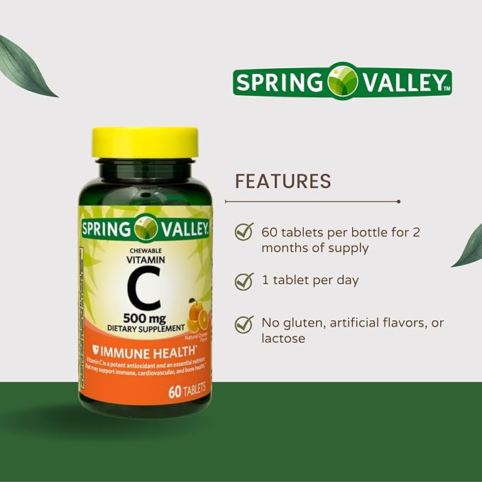 قرص ویتامین C اسپرینگ والی 500 میلی گرم 60 عدد Spring Valley Vitamin C یکی از مکملهای تغذیهای محبوب و موثر برای تقویت سلامت سیستم ایمنی و پشتیبانی از سلامت عمومی بدن است. این قرصها با طعم خوشایند پرتقال، حاوی 500 میلیگرم ویتامین C در هر وعده هستند که نیاز روزانه بدن به این ویتامین ضروری را تامین میکند.