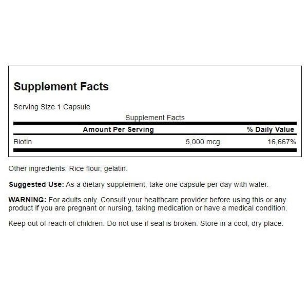 کپسول Swanson Biotin 5000 mcg یک مکمل ایدهآل برای حمایت از سلامت مو، پوست و ناخن است. این محصول با دوز مؤثر و ترکیبات خالص خود، نیازهای روزانه بدن به بیوتین را برآورده کرده و به بهبود زیبایی و سلامت کلی شما کمک میکند. با مصرف منظم این مکمل، میتوانید از موهایی سالمتر، پوستی شادابتر و ناخنهایی قویتر بهرهمند شوید.