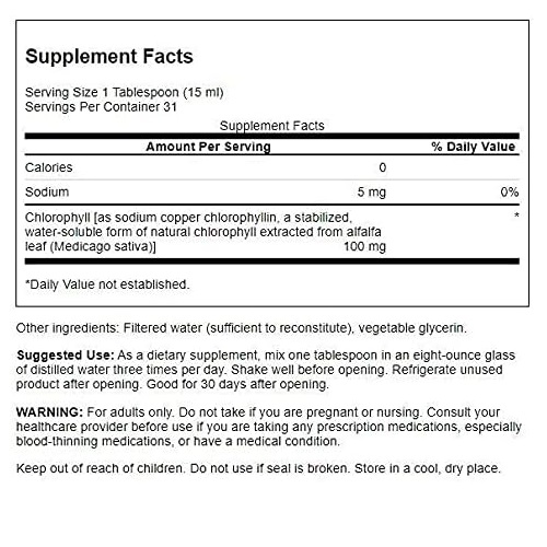کلروفیل مایع سوانسون یک مکمل غذایی است که از عصاره برگ‌های آلفافا به دست می‌آید. این محصول به صورت مایع تولید شده تا جذب آن برای بدن آسان‌تر و سریع‌تر باشد. هر وعده از این مکمل حاوی 100 میلی‌گرم کلروفیل است که مقدار مناسبی برای حمایت از سلامت عمومی بدن می‌باشد. فرم مایع این محصول، علاوه بر جذب بهتر، می‌تواند به راحتی در آب یا نوشیدنی‌های دیگر مخلوط شده و به صورت روزانه مصرف شود.