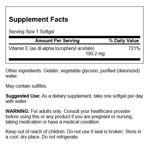 ویتامین ای سوانسون Swanson Premium Vitamin E برای برخی از اساسی ترین عملکردهای روزمره بدن از جمله کمک به مبارزه با بیماری ها و جلوگیری از استرس اکسیداتیو مفید است. ویتامین E، مشابه ویتامین B، در واقع گروهی از هشت ترکیب محلول در چربی است، نه یک نوع ویتامین. اینها به برخی از ویتامین‌های ضروری بدن شما برای عملکرد صحیح کمک می‌کنند، مانند ویتامین D برای استخوان‌ها و ویتامین K برای خون. آنها در انواع غذاها یافت می شوند و در مکمل ها گنجانده می شوند. فواید بسیاری از ویتامین E وجود دارد که آن را برای سلامتی شما حیاتی می کند. ویتامین E از سیستم ایمنی بدن حمایت می کند و می تواند به بینایی سالم کمک کند. به دلایل متعدد، این ویتامین در رژیم غذایی و در کنار مکمل‌ها برای جلوگیری از سطوح پایین ضروری است. این محصول در هر وعده 180 میلی گرم ویتامین E را ارائه می دهد.