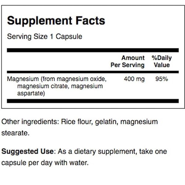 منیزیم 400 میلی گرم 100 درصد، سایر مواد: آرد برنج، ژلاتین، استئارات منیزیم