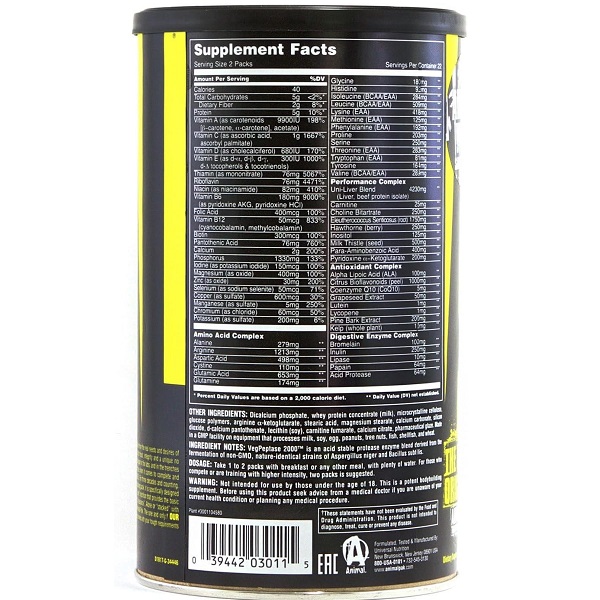 انیمال پک یک مولتی ویتامین کامل با مواد معدنی، اسیدهای آمینه، آنتی اکسیدان ها، حمایت از سیستم ایمنی، حمایت از کبد و بسیاری از مزایای اضافی دیگر است.