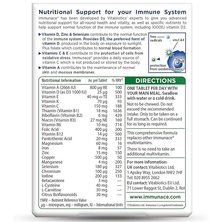 فرمول Immunace با همکاری متخصصان بین المللی در تحقیقات مواد مغذی ساخته شده است. Immunace یک فرمول جامع شامل ویتامین D، روی و سلنیوم را ارائه می دهد که به عملکرد طبیعی سیستم ایمنی کمک می کند، به علاوه حاوی فولات است که به خون سازی طبیعی کمک می کند. Immunace یکی از اولین مکملهای سیستم ایمنی بریتانیا است که حاوی ویتامین D است و نه تنها به حفظ استخوانها و عملکرد طبیعی عضلات کمک میکند، بلکه به عملکرد طبیعی سیستم ایمنی نیز کمک میکند.