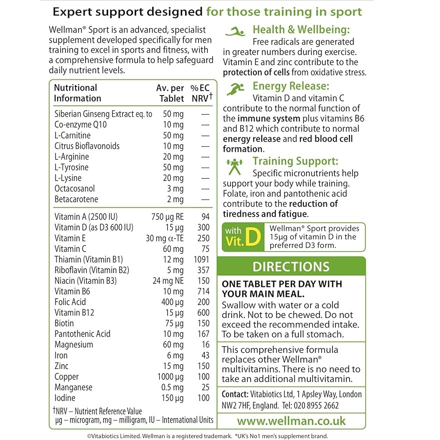 ریزمغذیهای خاصی برای کمک به حمایت از بدن در حین تمرین یا تمرین گنجانده شده است، از جمله فولات، آهن، اسید پانتوتنیک و ویتامین C که به کاهش خستگی و کوفتگی کمک میکنند. Wellman Sport همچنین حاوی مواد مغذی کلیدی دیگری از جمله عصاره جینسینگ سیبری و کوآنزیم Q10، ال-کارنیتین و اکتاکوزانول است.