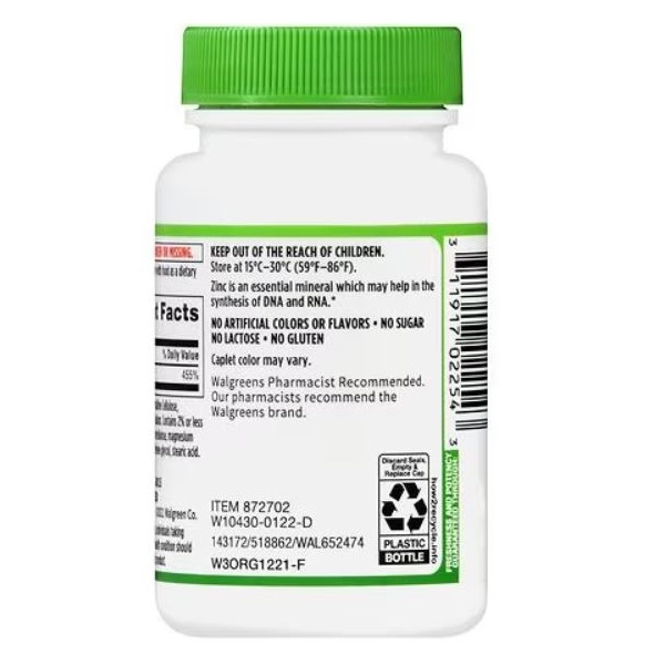 زینک والگرینز Walgreens Zinc به حمایت از عملکرد سیستم ایمنی کمک می کند و در هر وعده 50 میلی گرم زینک را ارائه می دهد. این محصول بدون گلوتن است. زینک یک ماده معدنی ضروری است که به سنتز DNA و RNA کمک می کند.