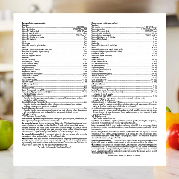 این محصول کاملترین مولتی ویتامین برای زنان است که مقدار کامل توصیه شده روزانه ویتامینهایی را که ممکن است کمبود آنها را داشته باشید، فراهم میکند و حاوی ترکیبی انرژیبخش از ۲۸ میوه و سبزیجات کامل است.