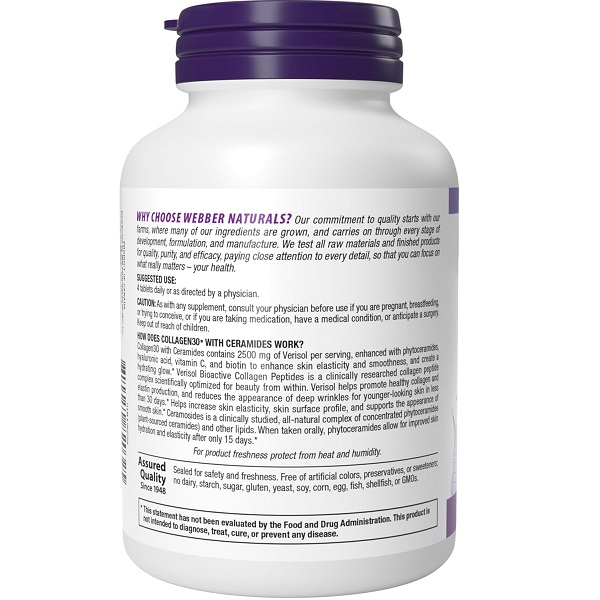 Collagen30 Webber Naturals با استفاده از پپتیدهای فعال و زیستدردسترس کلاژن نوع ۱ و ۳، کاهش کلاژن را جبران کرده، پوست را شادابتر کرده و روند پیری را کندتر میکند.