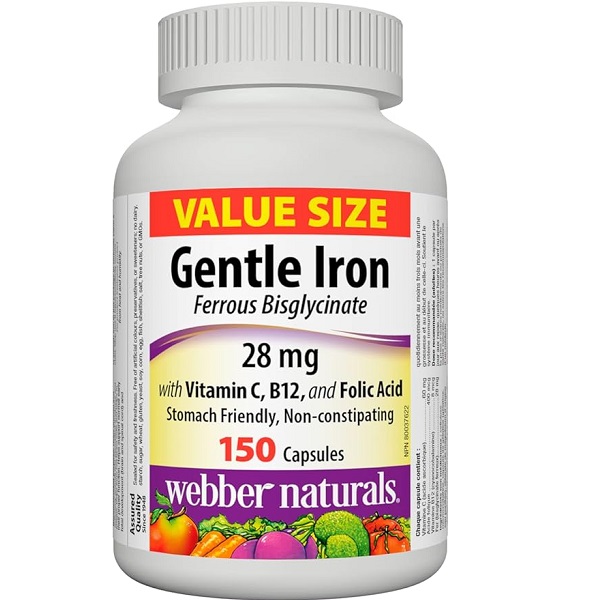 قرص آهن وبر نچرالز حاوی ویتامین C، ویتامین B12 و فولیک اسید 150 کپسول Webber Naturals Gentle Iron Supplement with Vitamin C, B12 and Folic Acid حاوی بیس گلیسینات آهن است که یک فرم ملایم از آهن است که جذب سریعتری دارد و مشکلات گوارشی را ایجاد نمی کند. آهن ملایم نسبت به مکمل های آهن استاندارد کمتر باعث ایجاد یبوست یا حالت تهوع می شود.