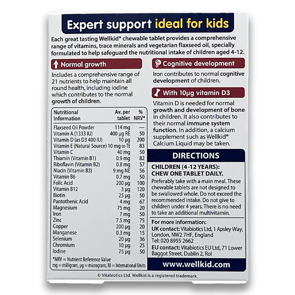 مولتی ویتامین کودکانه WELLKID ویتابیوتیکس یک مکمل غذایی است که به طور خاص برای کودکان ۴ تا ۱۲ سال طراحی شده است. این محصول در قالب قرصهای جویدنی خوشمزه ارائه میشود که استفاده از آن را برای کودکان آسان میکند. Wellkid Smart Chewable بهطور ویژه فرموله شده است تا مجموعهای کامل از ویتامینها و مواد معدنی ضروری برای رشد و توسعه کودکان را تأمین کند.